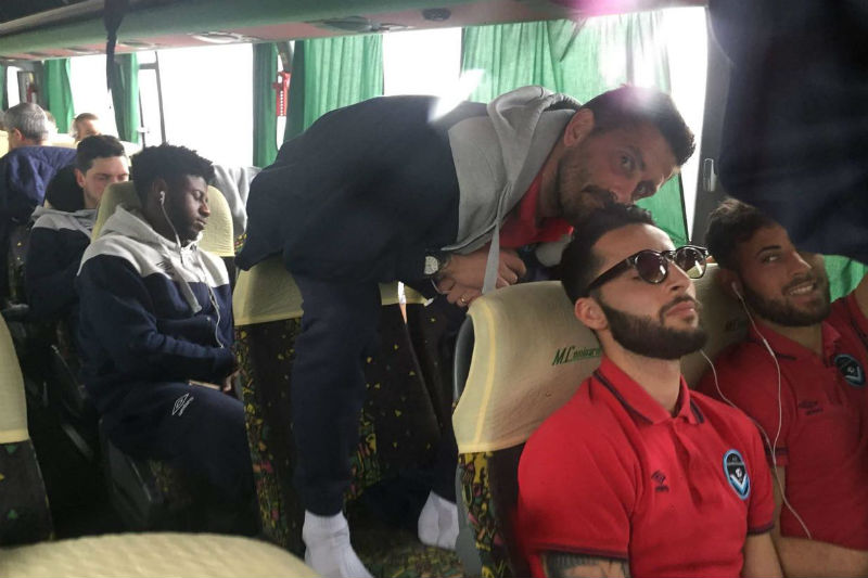 “Mezzo gol è stato merito del controllo, poi si sa, quando colpisci con il piede debole sei ancora più concentrato e focalizzato sull’obiettivo”… già, l’obiettivo. Quella metà in tribuna. Corsa perdifiato verso il fisioterapista Mauro che custodiva la maglia con dedica preparata da Riccardo. “Emozioni? Tante, ma non mi chiedere di riviverle.. per un attimo ho visto tutto nero”. Black-out fino al momento in cui Chiarello riaccende la luce alzando la maglia con dedica: “era la festa della mamma e quel gol è tutto suo che si è fatta 200 chilometri per venirmi a vedere”. Trasferte. Viaggi lunghi che aiutano a fare gruppo. “Ricordo con piacere la trasferta a Siena: infernale. Cinque ore e mezza passate a fare l’asta del fantacalcio”. Chi ha vinto? Chiedo incuriosito. “Montesano con la squadra più scarsa”, mi confessa ridendo. Un clima unico, quasi surreale.