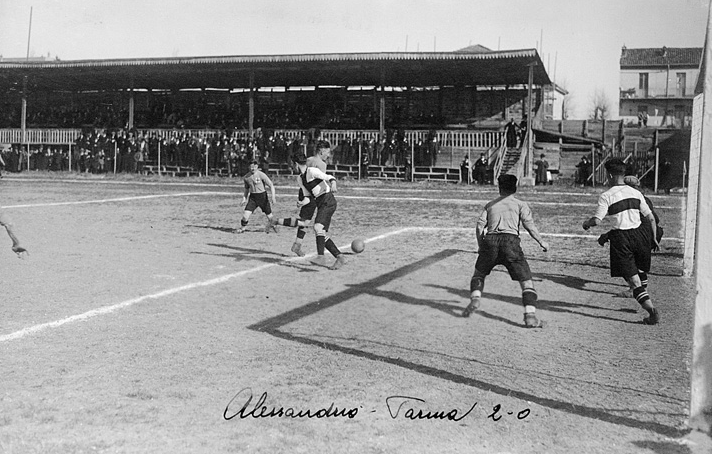 Nelle foto sotto il titolo: Alessandria-Parma 2-0, torneo 1925-’26. Un attaccante alessandrino minaccia la porta del Parma.