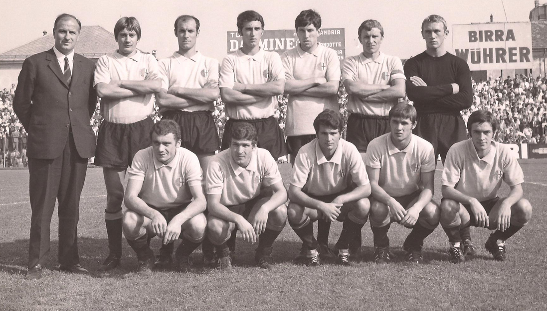 Alessandria, campionato 1969-’70. Da sinistra in piedi: l’allenatore Manente, Tomy, Magri, Chinellato, Marella, Piacentini, Moriggi. In basso: Colombo, Legnaro, Dori, Villa, Coppetti.