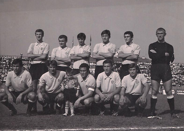 Ancora un undici dei Grigi nel campionato 1968-’69. In piedi da sinistra: Daolio, Colombo, Berta, Villa, Cervio, Moriggi. Accosciati: Bagnasco, Tomy, Lojacono, Chinellato, Rossi.
