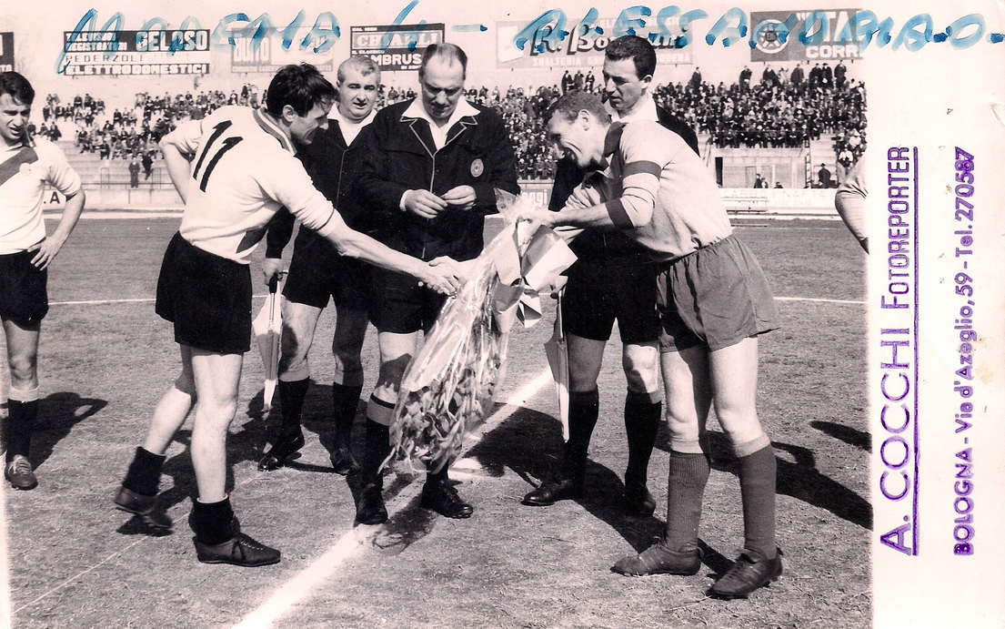 Modena-Alessandria 4-0, campionato 1965-’66. Oldani e il capitano modenese si scambiano i fiori prima del match.